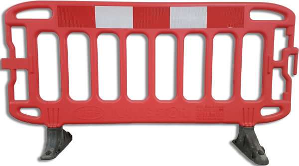 Valla peatonal plástica 1×1 para delimitación. Valla peatonal plástica de 1×1 m para delimitar zonas de trabajo y paso en entornos urbanos.
